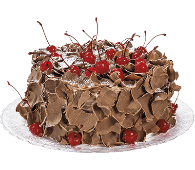 Massa preta molhadinha, dois recheios de chantilly branco com cereja em pedaços, coberto com chantilly, raspas de chocolate e cerejas.